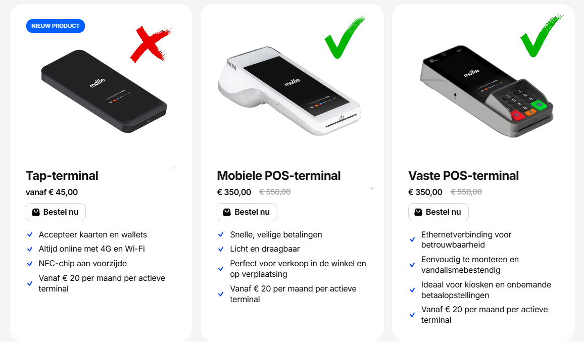Wil je aan de slag met Mollie PIN-terminals? Bekijk en bestel de terminals eenvoudig op de website van Mollie: